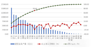從全國(guó)建筑業(yè)企業(yè)房屋竣工面積構(gòu)成情況看,住宅房屋竣工面積占最大比重,為56.62%;廠房及建筑物竣工面積占21.14%;商業(yè)及服務(wù)用房屋竣工面積占 7.52%;其他種類房屋竣工面積占比均在5%以下。