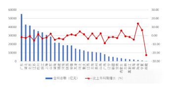 圖 6 2025 年上半年各地區(qū)建筑業(yè)企業(yè)合同總額及其增長(zhǎng)情況